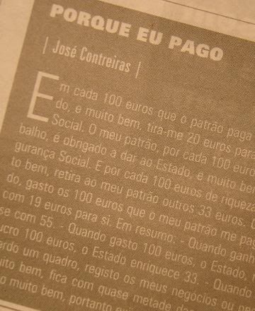 ...circulou na net um texto intitulado "Porque eu pago", publicado aqui, cuja autoria era desconhecida. Era, mas já não é! O quinzenário GAZETA DA BEIRA, n.º 442, de 14 de Outubro de 2004, desvenda a paternidade do referido texto: José Contreiras!