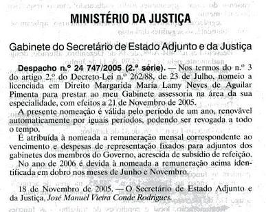 ...o Secretário de Estado Adjunto e da Justiça obteve mais uma vitória no combate ao desemprego e na luta contra a discriminação das mulheres. Deu um emprego à licenciada em Direito Margarida Maria Lamy Neves Aguilar Pimenta (pelo nome vê-se que a pequena devia estar necessitada) para prestar assessoria na área da sua especialidade (o Direito entenda-se).